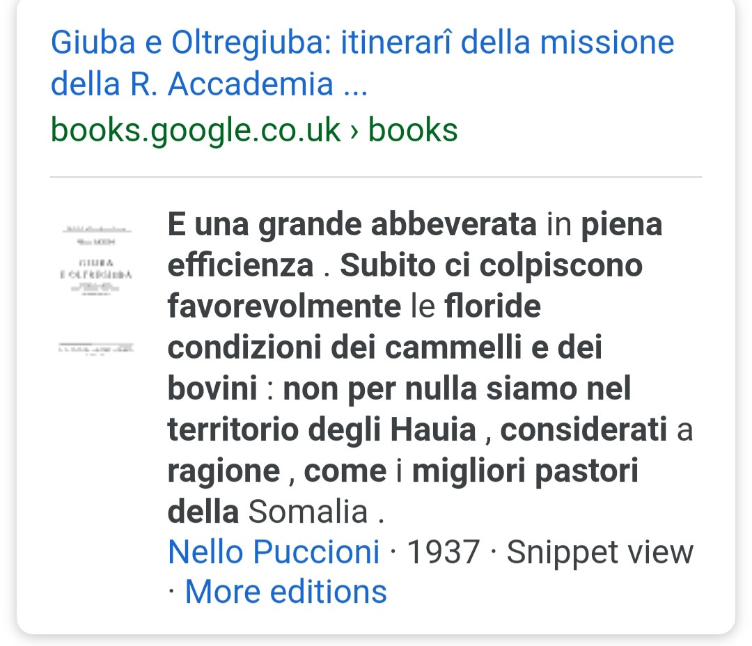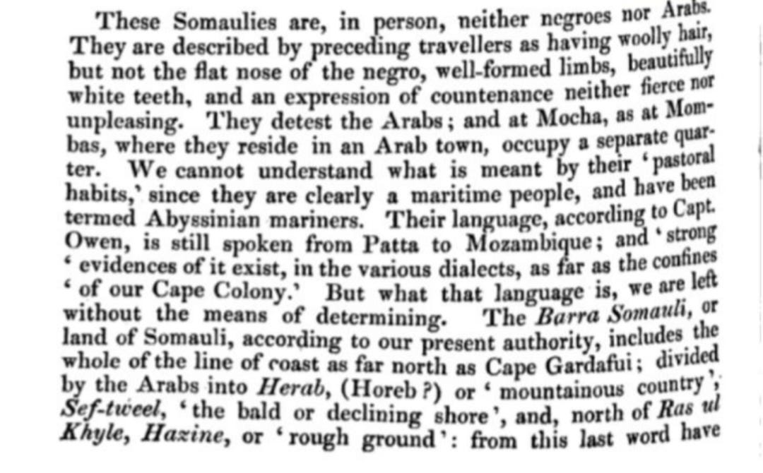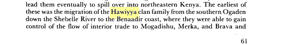 The Hauia of the Shebeli also tend to the SW and have groups already in southern Juba, others numerous in the Doi and still others in the area of Brava. It should be noted that the movement towards the SW is faster for the more northerly Hawiya tribes and therefore further away from the rivers. That is, for the Habar Gidir and the Wa'ēslä they have already branched out among the same Hawiyya tribes closest to the river. It is a proverb among the Hawiya that "Footprint Turning to the South does not return to the North."