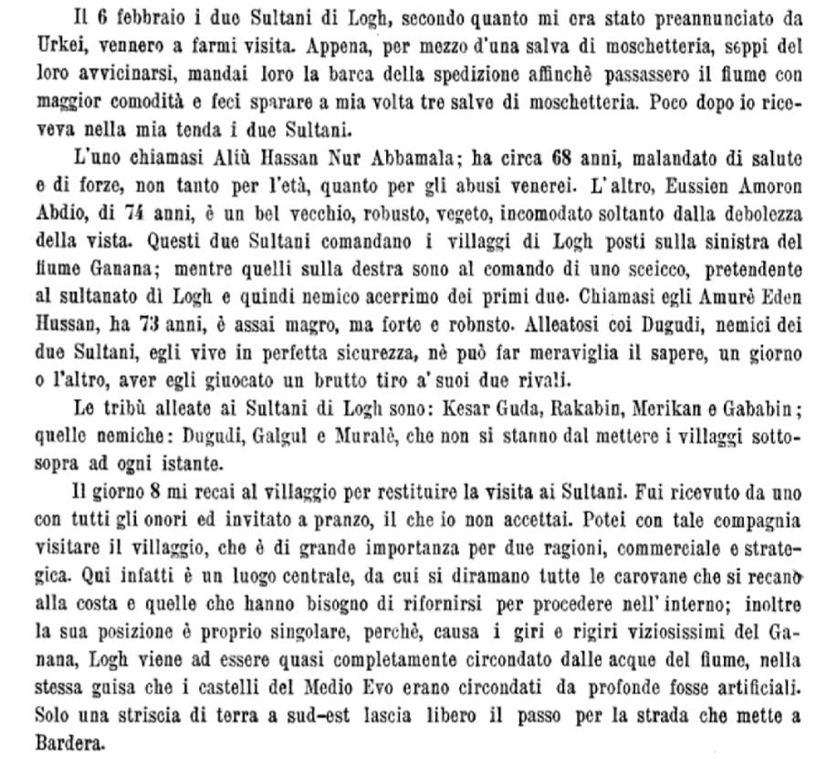 On February 6, the two Sultans of Logh, according to what had been announced to me by Urkei, came to visit me. As soon as, by means of a volley of musketry, I stopped their approach, I sent them the boat of the expedition so that they could pass the river more comfortably, and in my turn I fired three barrels of musketry. A little later I received the two Sultans in my tent. The one is called Aliù Hassan Nur Abbamala; is about 68 years old, in poor health and strength, not so much for age as for venereal abuse. The other, Eussion Amoron Abdio, aged 74, is a handsome old man, robust, healthy, bothered only by weakness of sight. These two Sultans command the villages of Logh located on the left of the Ganana River; while those on the right are under the command of a sheikh, a pretender to the sultanate of Logh and therefore a bitter enemy of the first two. He is called Amurè Eden Hussan, he is 73 years old, he is very thin, but strong and robust. Allying himself with the Dugudi, enemies of the two Sultans, he lives in perfect safety, nor can it be surprising to know, one day or another, that he has played a bad trick on his two rivals. The tribes allied to the Sultans of Logh are: Kesar Guda, Rakabin, Merikan and Gababin; the enemy ones: Dugudi, Galgul and Muralè that they are not trying to turn the villages upside down at any moment.