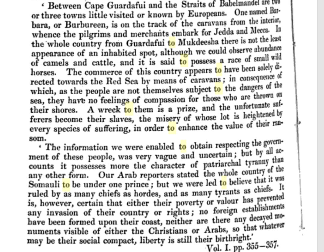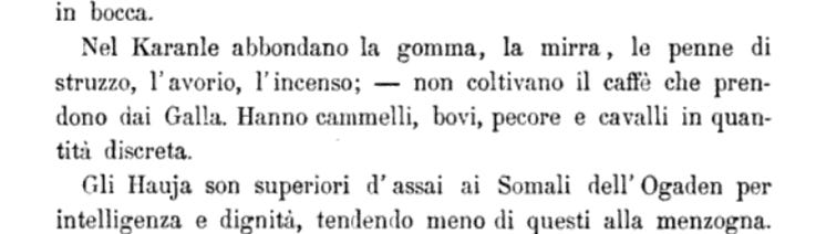 In the region of Karanle, gum, myrrh, ostrich feathers, ivory, frankincense abound - they do not grow the coffee as they get it from the Galla. They have camels, cattle, sheep and horses in fair quantities. The Hauija are far superior to the Somalis of Ogaden in intelligence and dignity, tending to lie much less than others.
